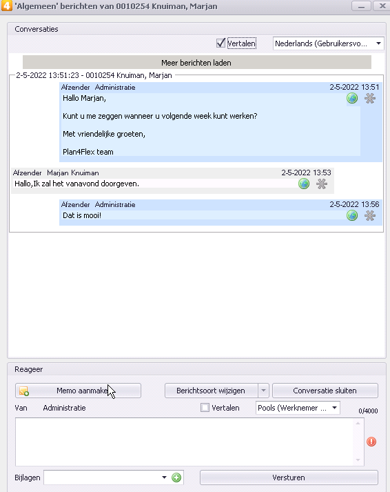Zoals je ziet is de correspondentie in de voorkeurstaal van de lezer. Voor de administratie is dit Nederlands, Marjan spreekt het liefst Pools. Je kantoormedewerkers zien ook de vertalingsslag en kunnen eventueel ook het originele bericht inzien. De uitzendkracht krijgt de berichten alleen in zijn eigen voorkeurstaal te zien.