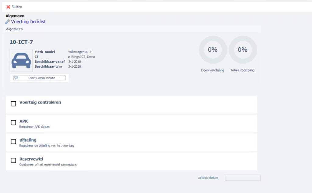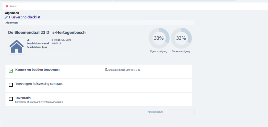 Met de checklists heb je een overzicht per flexkracht, huis of voertuig. En van wat jij als kantoormedewerker nog moet doen. Het kan namelijk zijn dat jouw voortgang op 100% staat, terwijl een andere afdeling nog taken af te vinken heeft.