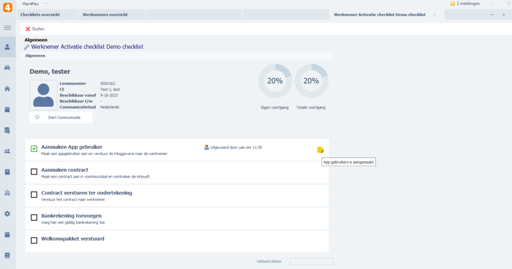 Weg met losse post-its of reminders! Met checklists in Plan4Flex leg je eenvoudig vast welke voortgang je operationele collega’s boeken. Maak checklists voor elk onderdeel dat speelt op de werkvloer: voor activatie van een nieuwe collega, inventaris van een huisvesting of het aanmelden van een nieuw voertuig.