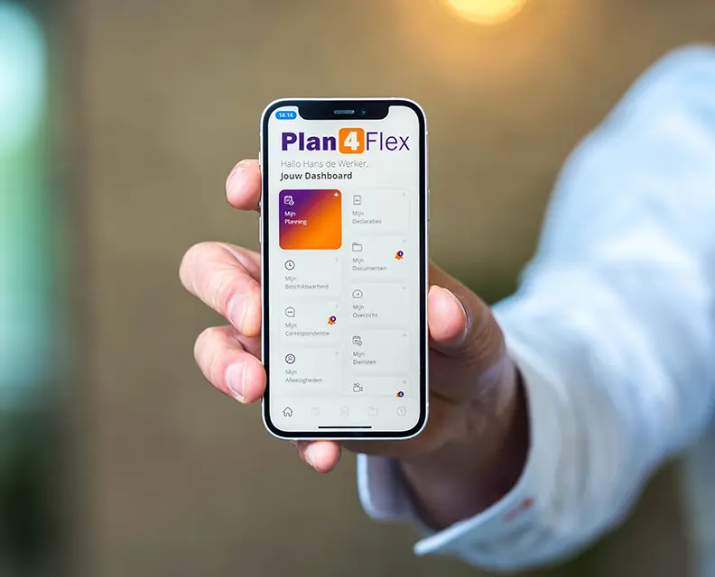Met de Plan4Flex hebben kantoormedewerkers en flexkrachten de touwtjes in handen. Elke dag gebruiken meer dan 90.000 uitzendkrachten de Plan4Flex App. Hier vinden zij alle informatie en documenten die zij nodig hebben voor hun werk. Uitzendkrachten zien hoe laat ze morgen opgehaald worden of vragen verlof aan via de app. Bekijken hun contracten en loonstroken. Ondertekenen formulieren of geven declaraties op. En dit alles in de eigen taal.